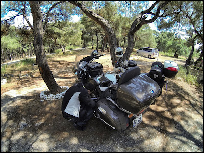 Aynen dun oldugu gibi kahvalti icin Lodos adli mekandayiz. Acik bufe... Baya acik bir bufe... Motorlar hazir, zincir yaglandi, cantalar yuklendi. Biliyoruz bugun yagmur yagacak. Az daha da yagmurluklari giymeden cikacaktik ki yola, basladi namussuz damlamaya... Bir son dakika karari ile gecirdik tulum yagmurluklari, cagri yan cantalarini da giydirdi, ki onlar istanbula gelirken iclerine su almislardi ve Ozgunun evinde kurutma ve yikama-temizleme operasyonlari yapmistik.