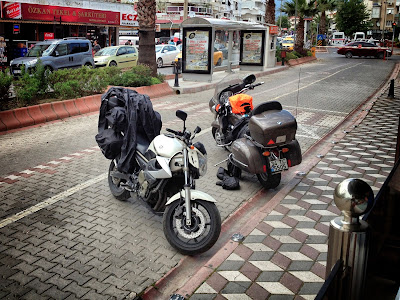 Gec kahvaltimizi yaparken R1200GS'li bir abi cay icmek icin bize katiliyor. Fethiye'ye surecegini ama bugun hava durumu agir yagis gosterdiginden 1 gun daha cundada bekleleyecegini soyluyor. Bir ona bakiyoruz, bir kendi motorlarimiza, bir daha ona bakiyoruz. Sonra birbirimize bakip gelirken zorlandigimiz kumsalin islak halini gozumuzde canlandiriyoruz. Akabinda hizli-sakin bir sekilde hazirlanip yola cikiyoruz.